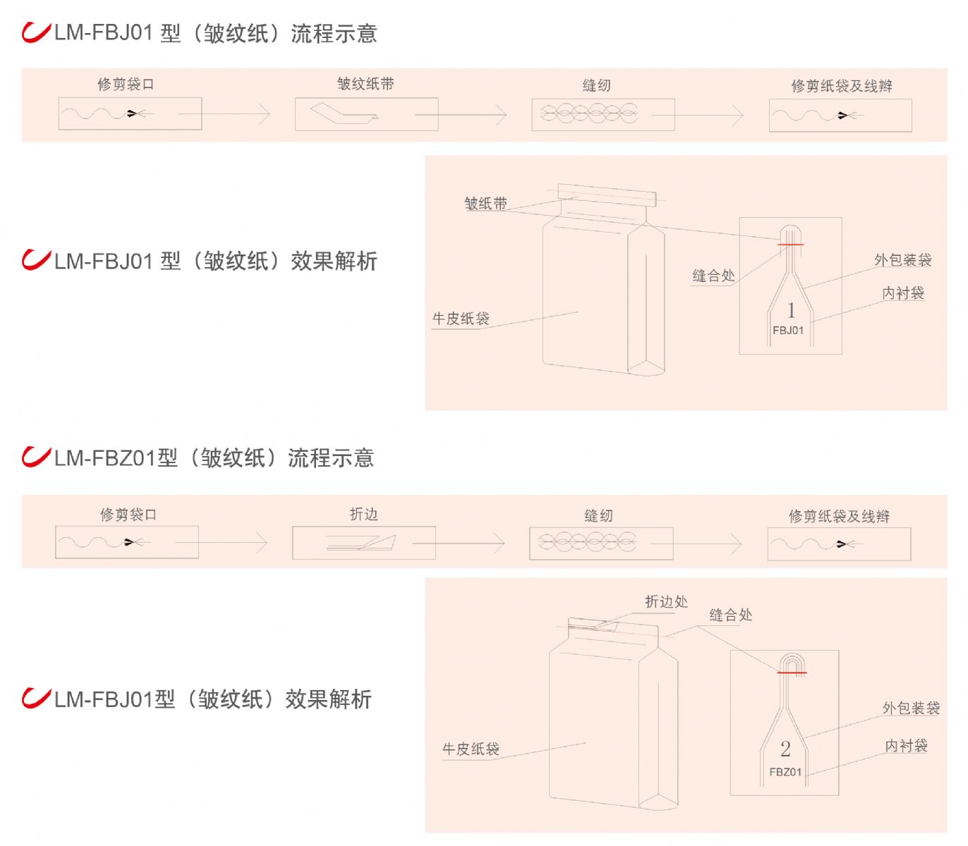 LM-FBJ/Z系列連續式卷/折邊縫包機適用于PE/PP塑料編織袋、牛皮紙袋、紙塑復合袋的一次成型式縫包封口處理。其包含機架立柱、斷線檢測裝置、斷帶檢測裝置、溫度調節監視裝置、自動剪線裝置、自動剪帶裝置。